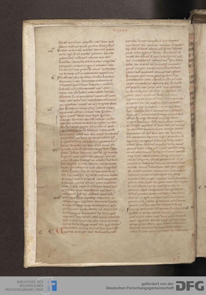 - TextGrid Repository (2017). Bibliothek des Bischöflichen Priesterseminars, Hs. 1. Inhalte. Bibliothek des Bischöflichen Priesterseminars Trier Hs. 1. Bibel aus St. Matthias/Altes Testament. Blatt 1v mit Fragment. Blatt 1v mit Fragment. Virtuelles Skriptorium St. Matthias. Bibliothek des Bischöflichen Priesterseminars Trier. https://hdl.handle.net/11378/0000-0006-0D5B-7