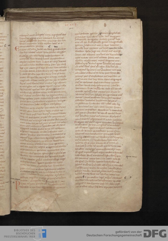 - TextGrid Repository (2017). Bibliothek des Bischöflichen Priesterseminars, Hs. 1. Inhalte. Bibliothek des Bischöflichen Priesterseminars Trier Hs. 1. Bibel aus St. Matthias/Altes Testament. Blatt 3r. Blatt 3r. Virtuelles Skriptorium St. Matthias. Bibliothek des Bischöflichen Priesterseminars Trier. https://hdl.handle.net/11378/0000-0006-0D61-F