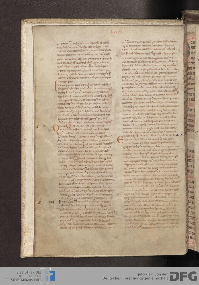 - TextGrid Repository (2017). Bibliothek des Bischöflichen Priesterseminars, Hs. 1. Inhalte. Bibliothek des Bischöflichen Priesterseminars Trier Hs. 1. Bibel aus St. Matthias/Altes Testament. Blatt 4v mit Fragment. Blatt 4v mit Fragment. Virtuelles Skriptorium St. Matthias. Bibliothek des Bischöflichen Priesterseminars Trier. https://hdl.handle.net/11378/0000-0006-0D67-9