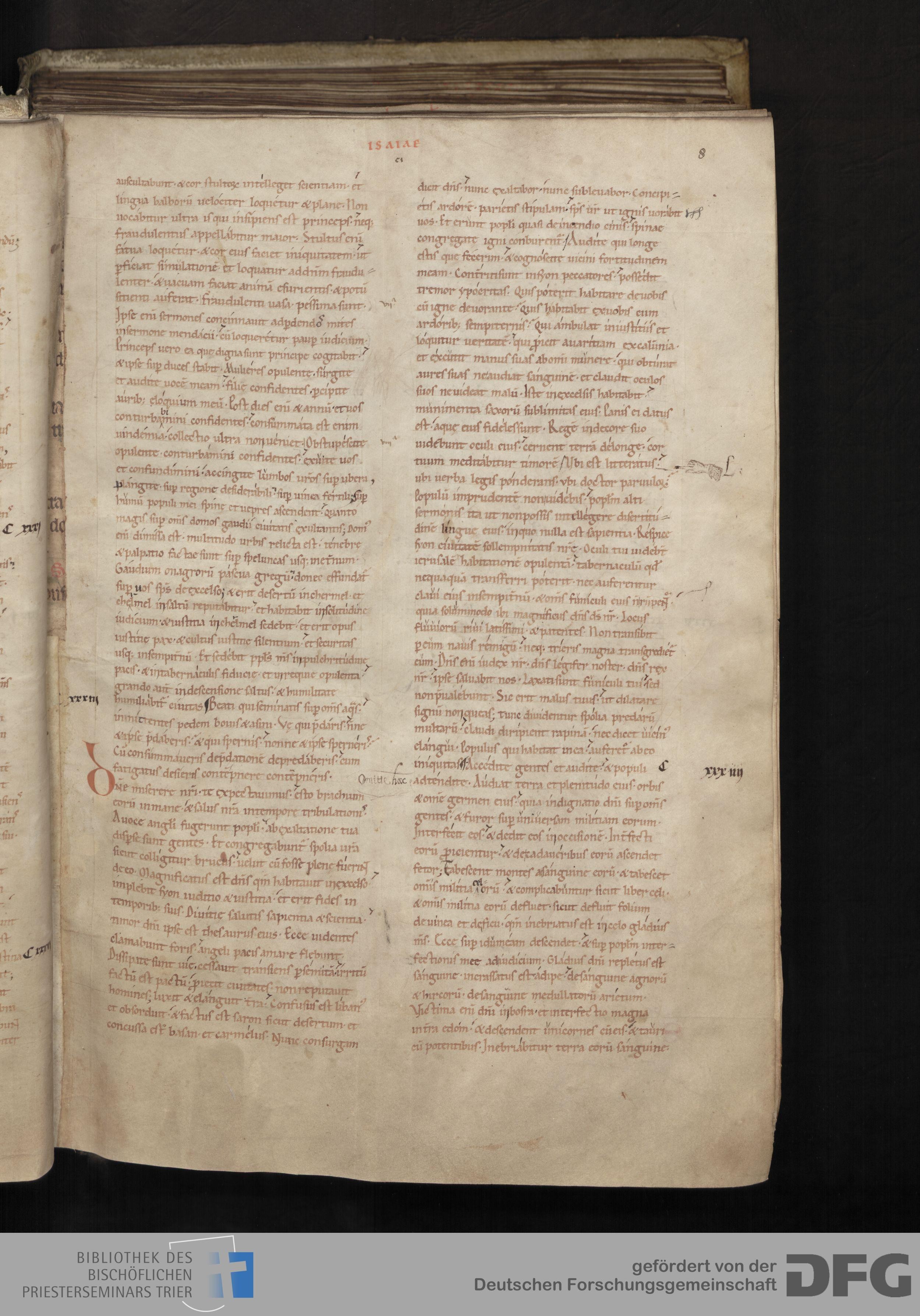 - TextGrid Repository (2017). Bibliothek des Bischöflichen Priesterseminars, Hs. 1. Inhalte. Bibliothek des Bischöflichen Priesterseminars Trier Hs. 1. Bibel aus St. Matthias/Altes Testament. Blatt 8r. Blatt 8r. Virtuelles Skriptorium St. Matthias. Bibliothek des Bischöflichen Priesterseminars Trier. https://hdl.handle.net/11378/0000-0006-0D75-9