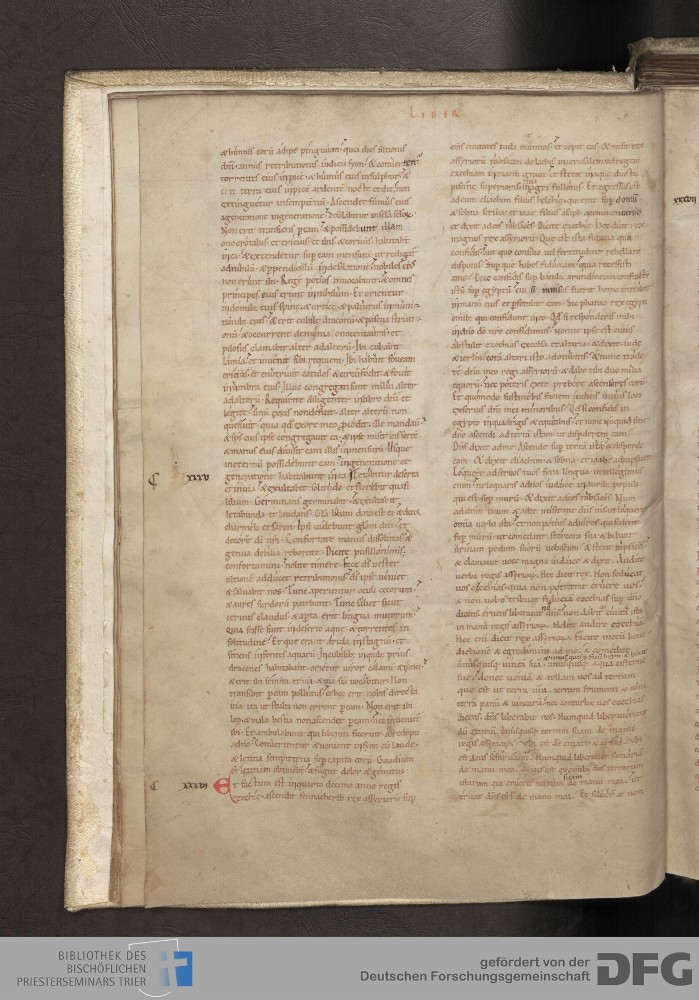 - TextGrid Repository (2017). Bibliothek des Bischöflichen Priesterseminars, Hs. 1. Inhalte. Bibliothek des Bischöflichen Priesterseminars Trier Hs. 1. Bibel aus St. Matthias/Altes Testament. Blatt 8v. Blatt 8v. Virtuelles Skriptorium St. Matthias. Bibliothek des Bischöflichen Priesterseminars Trier. https://hdl.handle.net/11378/0000-0006-0D77-7