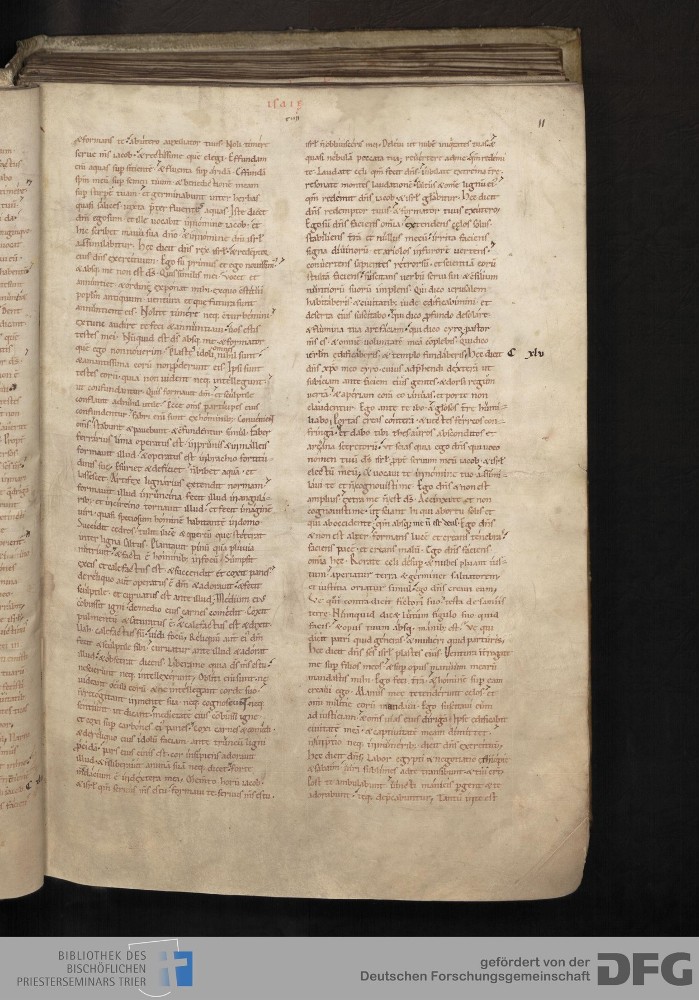 - TextGrid Repository (2017). Bibliothek des Bischöflichen Priesterseminars, Hs. 1. Inhalte. Bibliothek des Bischöflichen Priesterseminars Trier Hs. 1. Bibel aus St. Matthias/Altes Testament. Blatt 11r. Blatt 11r. Virtuelles Skriptorium St. Matthias. Bibliothek des Bischöflichen Priesterseminars Trier. https://hdl.handle.net/11378/0000-0006-0D81-A