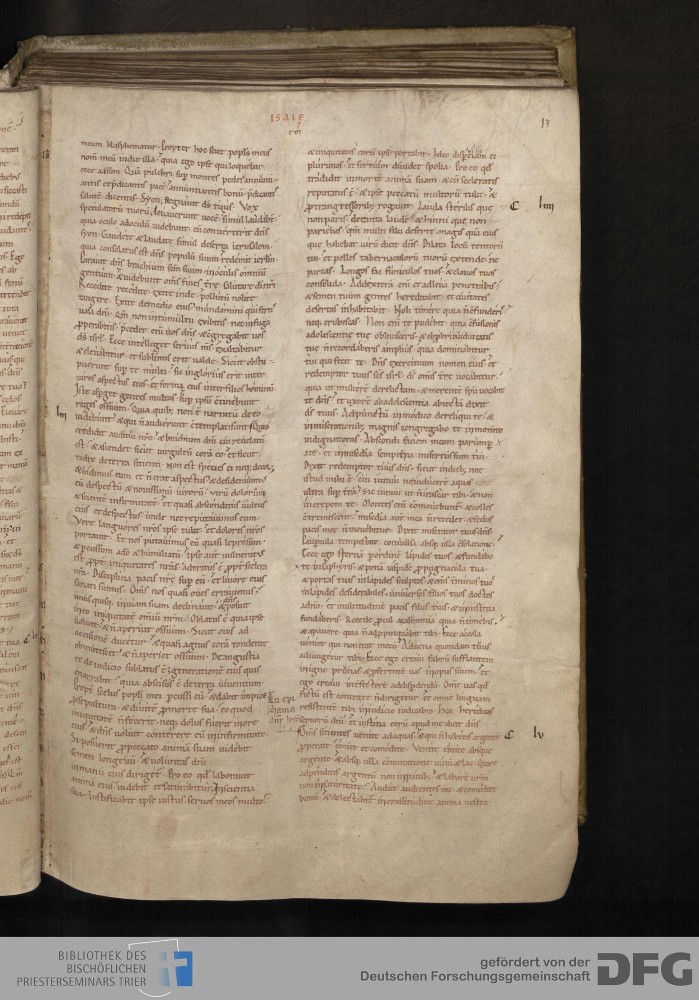 - TextGrid Repository (2017). Bibliothek des Bischöflichen Priesterseminars, Hs. 1. Inhalte. Bibliothek des Bischöflichen Priesterseminars Trier Hs. 1. Bibel aus St. Matthias/Altes Testament. Blatt 13r. Blatt 13r. Virtuelles Skriptorium St. Matthias. Bibliothek des Bischöflichen Priesterseminars Trier. https://hdl.handle.net/11378/0000-0006-0D89-2