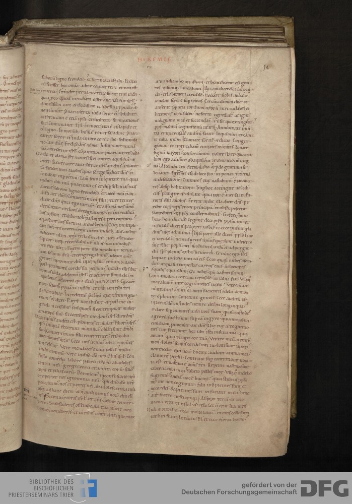 - TextGrid Repository (2017). Bibliothek des Bischöflichen Priesterseminars, Hs. 1. Inhalte. Bibliothek des Bischöflichen Priesterseminars Trier Hs. 1. Bibel aus St. Matthias/Altes Testament. Blatt 17r. Blatt 17r. Virtuelles Skriptorium St. Matthias. Bibliothek des Bischöflichen Priesterseminars Trier. https://hdl.handle.net/11378/0000-0006-0D99-0