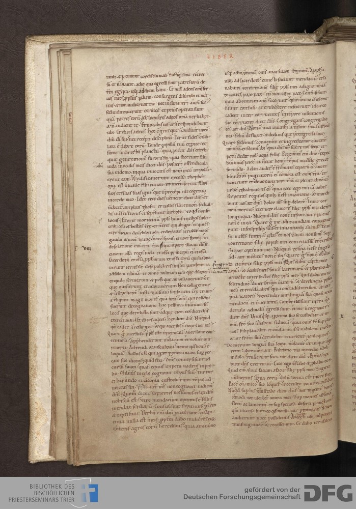 - TextGrid Repository (2017). Bibliothek des Bischöflichen Priesterseminars, Hs. 1. Inhalte. Bibliothek des Bischöflichen Priesterseminars Trier Hs. 1. Bibel aus St. Matthias/Altes Testament. Blatt 18v. Blatt 18v. Virtuelles Skriptorium St. Matthias. Bibliothek des Bischöflichen Priesterseminars Trier. https://hdl.handle.net/11378/0000-0006-0D9F-A