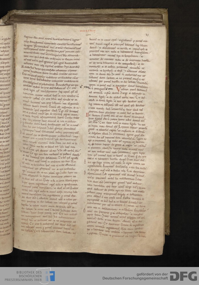 - TextGrid Repository (2017). Bibliothek des Bischöflichen Priesterseminars, Hs. 1. Inhalte. Bibliothek des Bischöflichen Priesterseminars Trier Hs. 1. Bibel aus St. Matthias/Altes Testament. Blatt 21r. Blatt 21r. Virtuelles Skriptorium St. Matthias. Bibliothek des Bischöflichen Priesterseminars Trier. https://hdl.handle.net/11378/0000-0006-0DA9-E