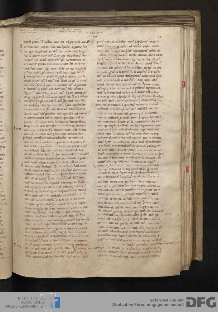 - TextGrid Repository (2017). Bibliothek des Bischöflichen Priesterseminars, Hs. 1. Inhalte. Bibliothek des Bischöflichen Priesterseminars Trier Hs. 1. Bibel aus St. Matthias/Altes Testament. Blatt 23r. Blatt 23r. Virtuelles Skriptorium St. Matthias. Bibliothek des Bischöflichen Priesterseminars Trier. https://hdl.handle.net/11378/0000-0006-0DB1-4