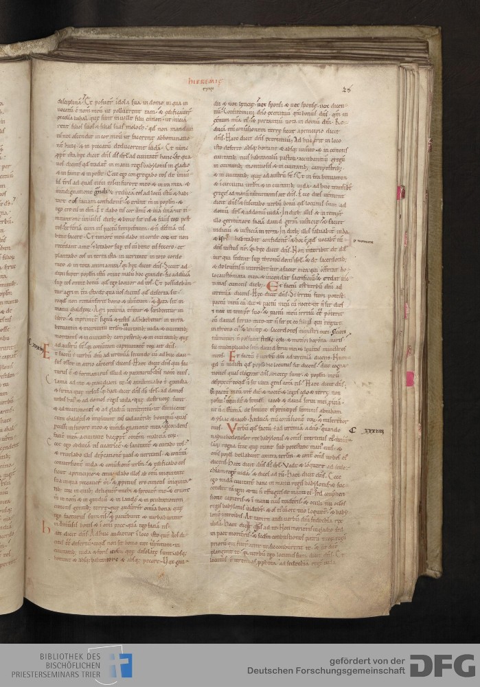 - TextGrid Repository (2017). Bibliothek des Bischöflichen Priesterseminars, Hs. 1. Inhalte. Bibliothek des Bischöflichen Priesterseminars Trier Hs. 1. Bibel aus St. Matthias/Altes Testament. Blatt 26r. Blatt 26r. Virtuelles Skriptorium St. Matthias. Bibliothek des Bischöflichen Priesterseminars Trier. https://hdl.handle.net/11378/0000-0006-0DBD-8