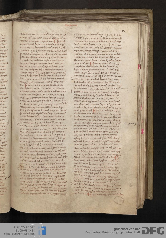 - TextGrid Repository (2017). Bibliothek des Bischöflichen Priesterseminars, Hs. 1. Inhalte. Bibliothek des Bischöflichen Priesterseminars Trier Hs. 1. Bibel aus St. Matthias/Altes Testament. Blatt 27r. Blatt 27r. Virtuelles Skriptorium St. Matthias. Bibliothek des Bischöflichen Priesterseminars Trier. https://hdl.handle.net/11378/0000-0006-0DC1-2