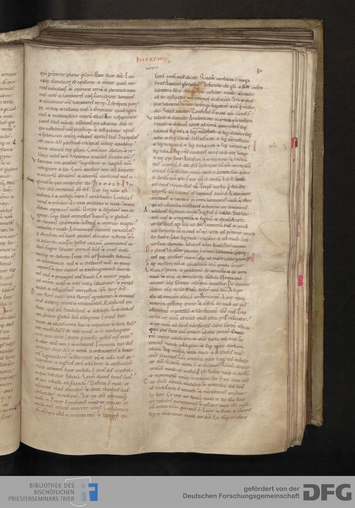 - TextGrid Repository (2017). Bibliothek des Bischöflichen Priesterseminars, Hs. 1. Inhalte. Bibliothek des Bischöflichen Priesterseminars Trier Hs. 1. Bibel aus St. Matthias/Altes Testament. Blatt 30r. Blatt 30r. Virtuelles Skriptorium St. Matthias. Bibliothek des Bischöflichen Priesterseminars Trier. https://hdl.handle.net/11378/0000-0006-0DCD-6