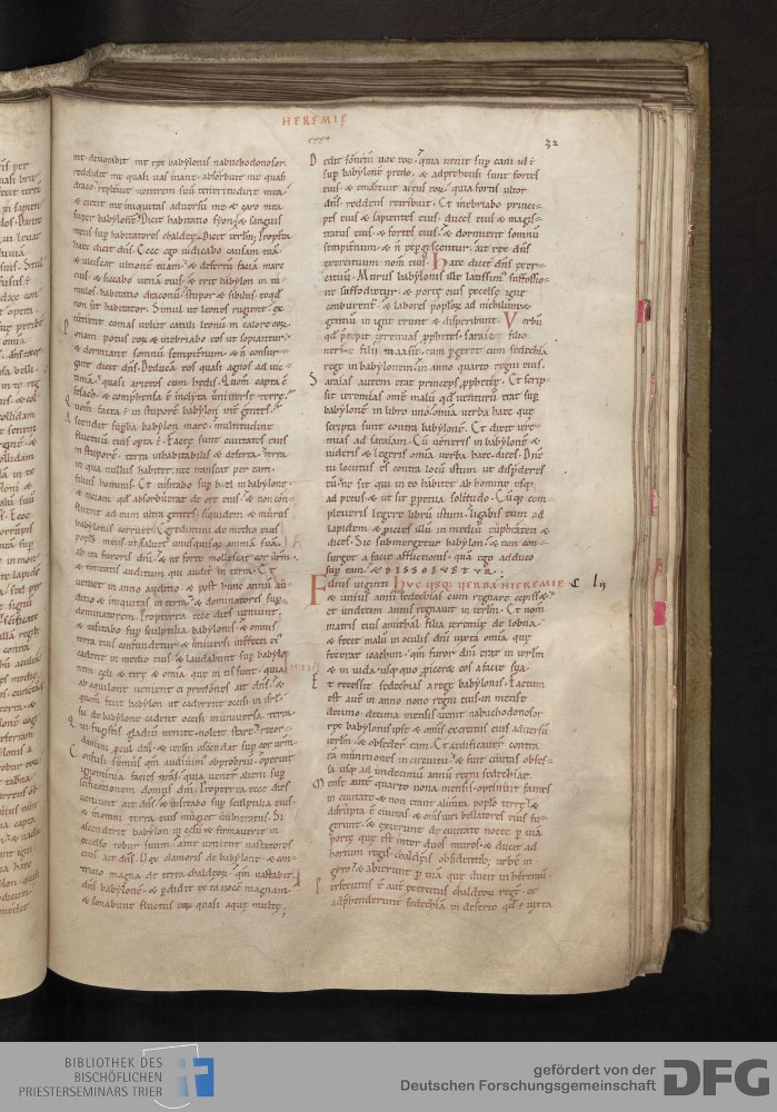 TextGrid Repository (2017). Bibliothek des Bischöflichen Priesterseminars, Hs. 1. Inhalte. Bibliothek des Bischöflichen Priesterseminars Trier Hs. 1. Bibel aus St. Matthias/Altes Testament. Blatt 32r. Blatt 32r. Virtuelles Skriptorium St. Matthias. Bibliothek des Bischöflichen Priesterseminars Trier. https://hdl.handle.net/11378/0000-0006-0DD5-C
