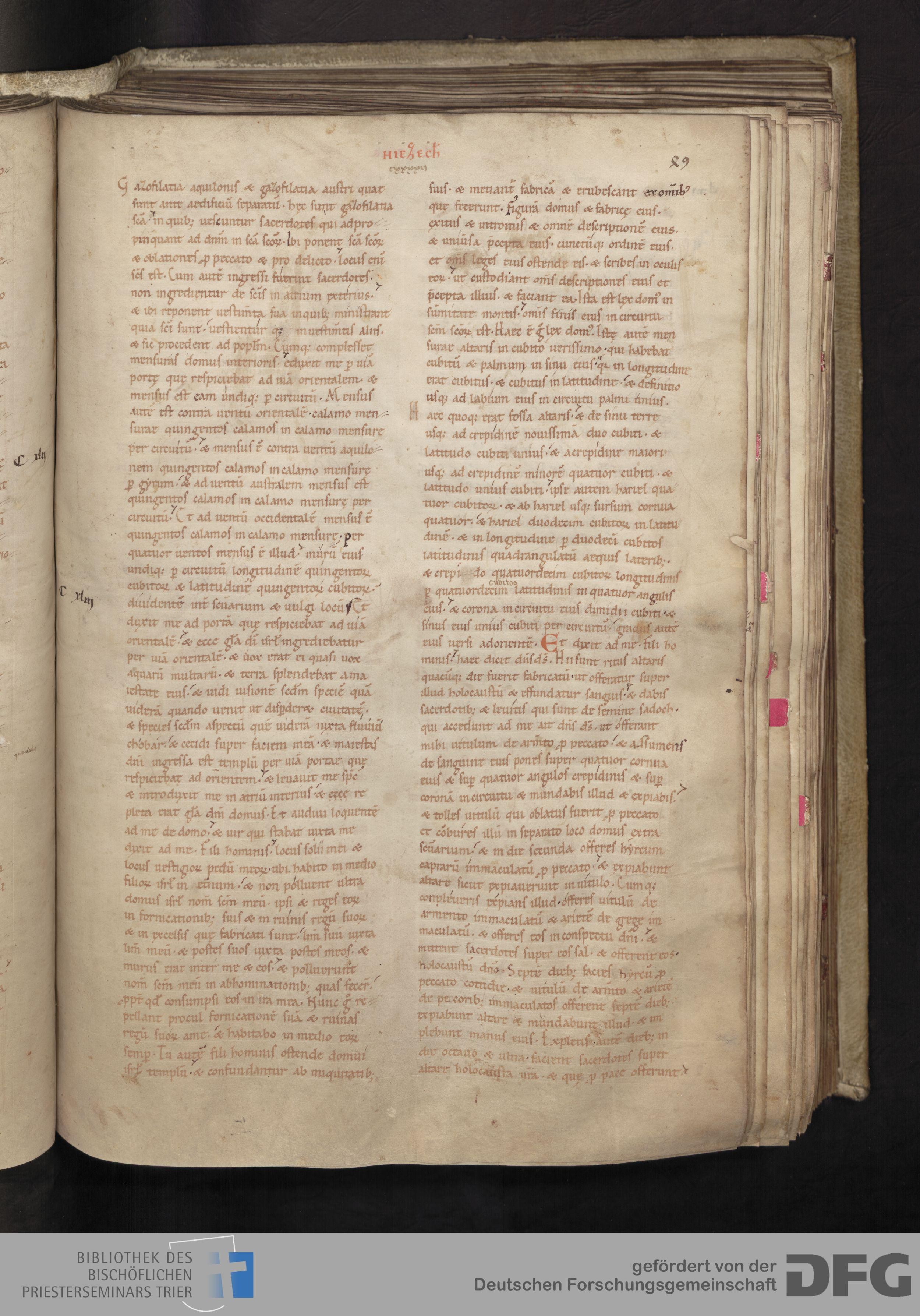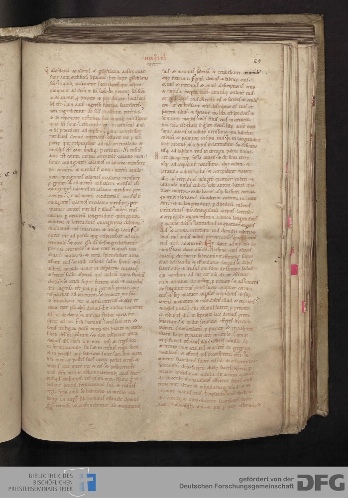 - TextGrid Repository (2017). Bibliothek des Bischöflichen Priesterseminars, Hs. 1. Inhalte. Bibliothek des Bischöflichen Priesterseminars Trier Hs. 1. Bibel aus St. Matthias/Altes Testament. Blatt 49r. Blatt 49r. Virtuelles Skriptorium St. Matthias. Bibliothek des Bischöflichen Priesterseminars Trier. https://hdl.handle.net/11378/0000-0006-0E19-0