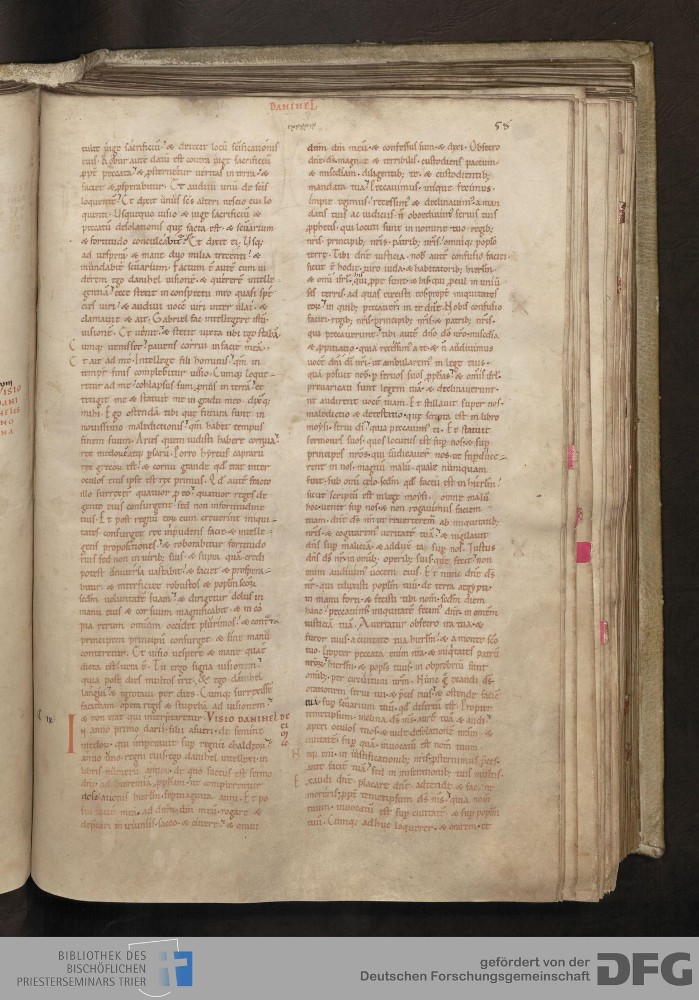- TextGrid Repository (2017). Bibliothek des Bischöflichen Priesterseminars, Hs. 1. Inhalte. Bibliothek des Bischöflichen Priesterseminars Trier Hs. 1. Bibel aus St. Matthias/Altes Testament. Blatt 56r. Blatt 56r. Virtuelles Skriptorium St. Matthias. Bibliothek des Bischöflichen Priesterseminars Trier. https://hdl.handle.net/11378/0000-0006-0E35-0
