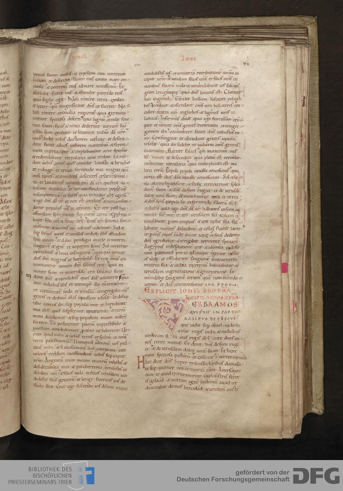 - TextGrid Repository (2017). Bibliothek des Bischöflichen Priesterseminars, Hs. 1. Inhalte. Bibliothek des Bischöflichen Priesterseminars Trier Hs. 1. Bibel aus St. Matthias/Altes Testament. Blatt 62r. Blatt 62r. Virtuelles Skriptorium St. Matthias. Bibliothek des Bischöflichen Priesterseminars Trier. https://hdl.handle.net/11378/0000-0006-0E4D-6