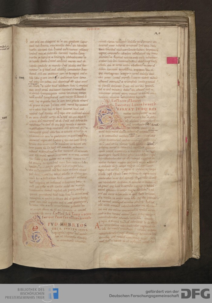 - TextGrid Repository (2017). Bibliothek des Bischöflichen Priesterseminars, Hs. 1. Inhalte. Bibliothek des Bischöflichen Priesterseminars Trier Hs. 1. Bibel aus St. Matthias/Altes Testament. Blatt 79r. Blatt 79r. Virtuelles Skriptorium St. Matthias. Bibliothek des Bischöflichen Priesterseminars Trier. https://hdl.handle.net/11378/0000-0006-0E91-7