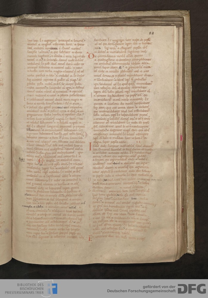 - TextGrid Repository (2017). Bibliothek des Bischöflichen Priesterseminars, Hs. 1. Inhalte. Bibliothek des Bischöflichen Priesterseminars Trier Hs. 1. Bibel aus St. Matthias/Altes Testament. Blatt 88r. Blatt 88r. Virtuelles Skriptorium St. Matthias. Bibliothek des Bischöflichen Priesterseminars Trier. https://hdl.handle.net/11378/0000-0006-0EB5-F