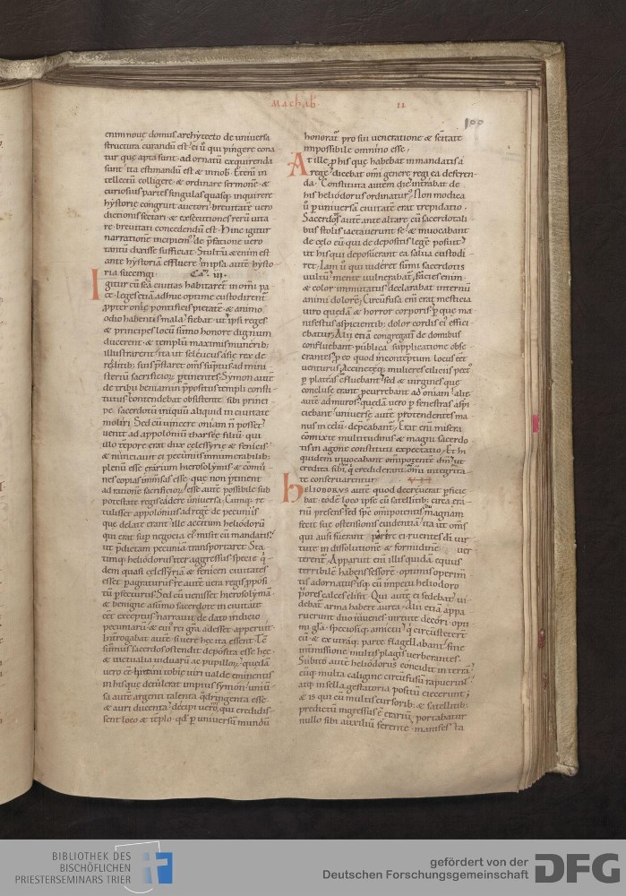 - TextGrid Repository (2017). Bibliothek des Bischöflichen Priesterseminars, Hs. 1. Inhalte. Bibliothek des Bischöflichen Priesterseminars Trier Hs. 1. Bibel aus St. Matthias/Altes Testament. Blatt 100r. Blatt 100r. Virtuelles Skriptorium St. Matthias. Bibliothek des Bischöflichen Priesterseminars Trier. https://hdl.handle.net/11378/0000-0006-0EE5-9