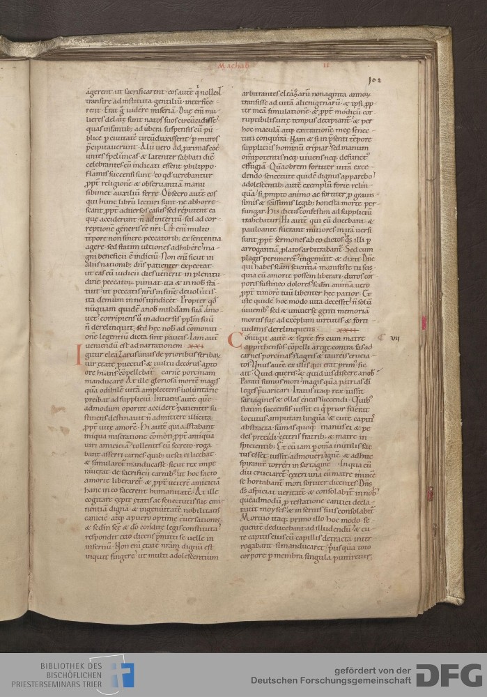 - TextGrid Repository (2017). Bibliothek des Bischöflichen Priesterseminars, Hs. 1. Inhalte. Bibliothek des Bischöflichen Priesterseminars Trier Hs. 1. Bibel aus St. Matthias/Altes Testament. Blatt 102r. Blatt 102r. Virtuelles Skriptorium St. Matthias. Bibliothek des Bischöflichen Priesterseminars Trier. https://hdl.handle.net/11378/0000-0006-0EED-1