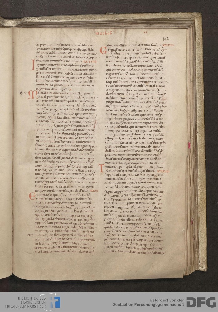 - TextGrid Repository (2017). Bibliothek des Bischöflichen Priesterseminars, Hs. 1. Inhalte. Bibliothek des Bischöflichen Priesterseminars Trier Hs. 1. Bibel aus St. Matthias/Altes Testament. Blatt 104r. Blatt 104r. Virtuelles Skriptorium St. Matthias. Bibliothek des Bischöflichen Priesterseminars Trier. https://hdl.handle.net/11378/0000-0006-0EF5-7