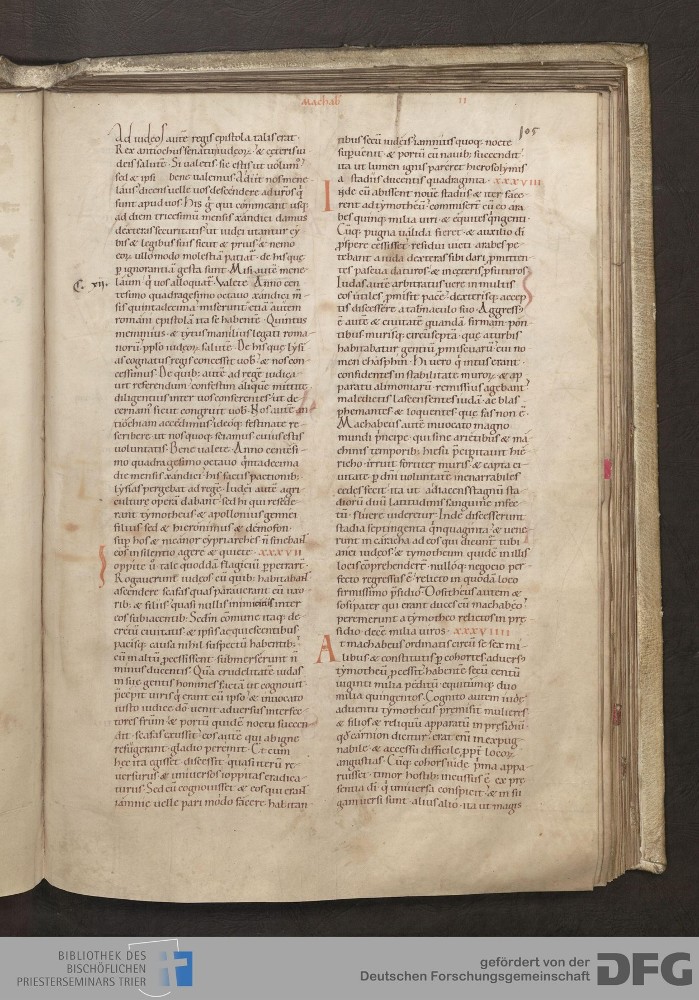 - TextGrid Repository (2017). Bibliothek des Bischöflichen Priesterseminars, Hs. 1. Inhalte. Bibliothek des Bischöflichen Priesterseminars Trier Hs. 1. Bibel aus St. Matthias/Altes Testament. Blatt 105r. Blatt 105r. Virtuelles Skriptorium St. Matthias. Bibliothek des Bischöflichen Priesterseminars Trier. https://hdl.handle.net/11378/0000-0006-0EF9-3