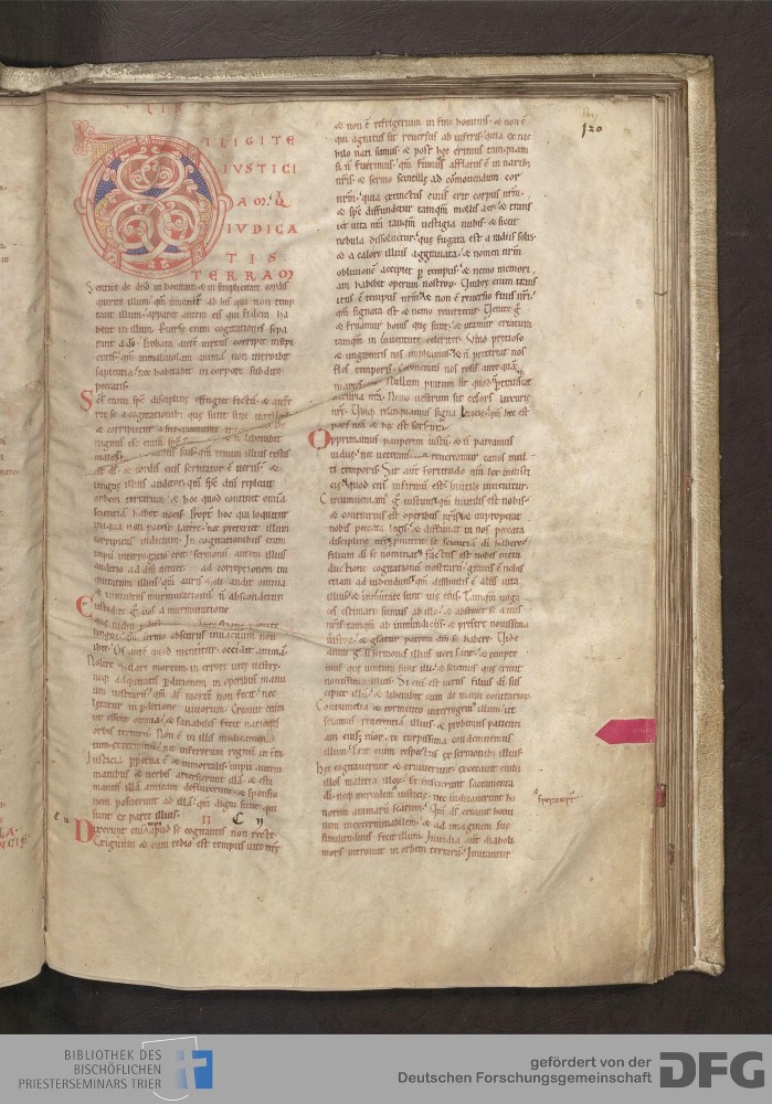 TextGrid Repository (2017). Bibliothek des Bischöflichen Priesterseminars, Hs. 1. Inhalte. Bibliothek des Bischöflichen Priesterseminars Trier Hs. 1. Bibel aus St. Matthias/Altes Testament. Blatt 120r. Blatt 120r. Virtuelles Skriptorium St. Matthias. Bibliothek des Bischöflichen Priesterseminars Trier. https://hdl.handle.net/11378/0000-0006-0F35-F