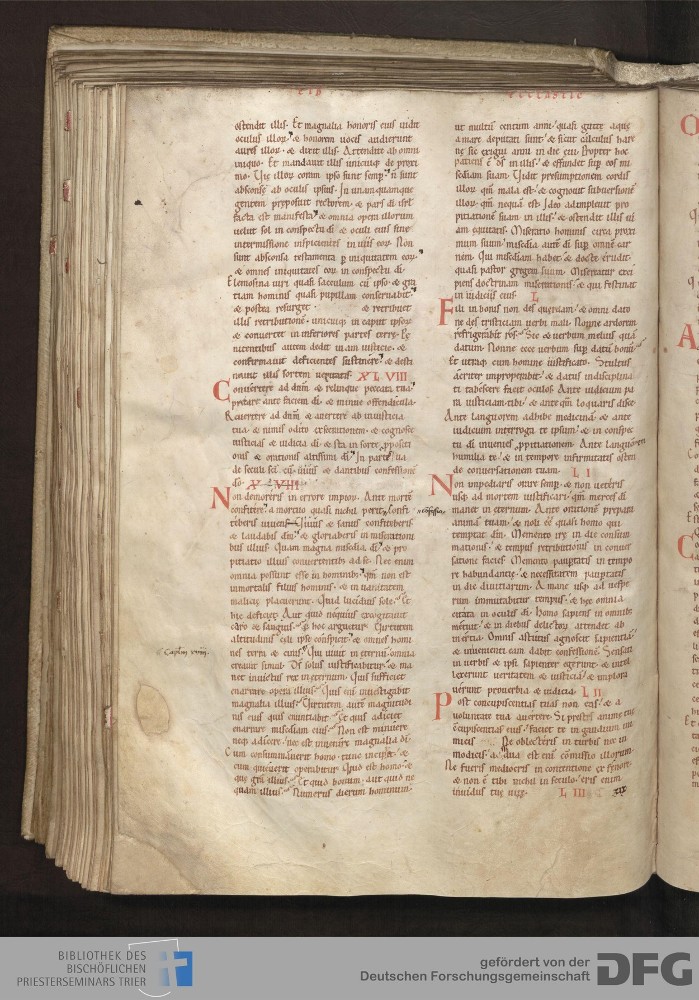 - TextGrid Repository (2017). Bibliothek des Bischöflichen Priesterseminars, Hs. 1. Inhalte. Bibliothek des Bischöflichen Priesterseminars Trier Hs. 1. Bibel aus St. Matthias/Altes Testament. Blatt 130v. Blatt 130v. Virtuelles Skriptorium St. Matthias. Bibliothek des Bischöflichen Priesterseminars Trier. https://hdl.handle.net/11378/0000-0006-0F5F-1