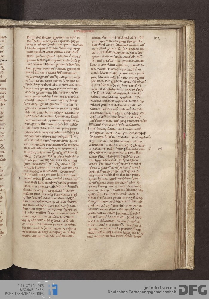 - TextGrid Repository (2017). Bibliothek des Bischöflichen Priesterseminars, Hs. 1. Inhalte. Bibliothek des Bischöflichen Priesterseminars Trier Hs. 1. Bibel aus St. Matthias/Altes Testament. Blatt 143r. Blatt 143r. Virtuelles Skriptorium St. Matthias. Bibliothek des Bischöflichen Priesterseminars Trier. https://hdl.handle.net/11378/0000-0006-0F91-6