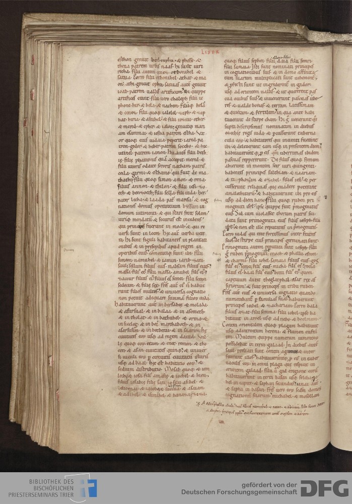 - TextGrid Repository (2017). Bibliothek des Bischöflichen Priesterseminars, Hs. 1. Inhalte. Bibliothek des Bischöflichen Priesterseminars Trier Hs. 1. Bibel aus St. Matthias/Altes Testament. Blatt 143v. Blatt 143v. Virtuelles Skriptorium St. Matthias. Bibliothek des Bischöflichen Priesterseminars Trier. https://hdl.handle.net/11378/0000-0006-0F93-4