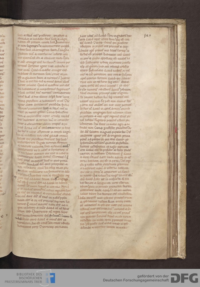 - TextGrid Repository (2017). Bibliothek des Bischöflichen Priesterseminars, Hs. 1. Inhalte. Bibliothek des Bischöflichen Priesterseminars Trier Hs. 1. Bibel aus St. Matthias/Altes Testament. Blatt 146r. Blatt 146r. Virtuelles Skriptorium St. Matthias. Bibliothek des Bischöflichen Priesterseminars Trier. https://hdl.handle.net/11378/0000-0006-0F9D-A