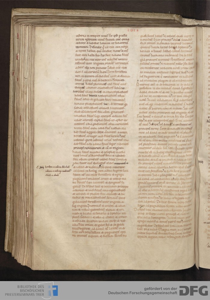 - TextGrid Repository (2017). Bibliothek des Bischöflichen Priesterseminars, Hs. 1. Inhalte. Bibliothek des Bischöflichen Priesterseminars Trier Hs. 1. Bibel aus St. Matthias/Altes Testament. Blatt 146v. Blatt 146v. Virtuelles Skriptorium St. Matthias. Bibliothek des Bischöflichen Priesterseminars Trier. https://hdl.handle.net/11378/0000-0006-0F9F-8