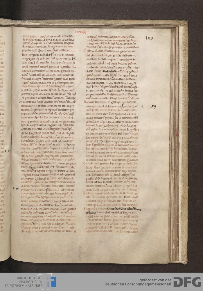 - TextGrid Repository (2017). Bibliothek des Bischöflichen Priesterseminars, Hs. 1. Inhalte. Bibliothek des Bischöflichen Priesterseminars Trier Hs. 1. Bibel aus St. Matthias/Altes Testament. Blatt 149r. Blatt 149r. Virtuelles Skriptorium St. Matthias. Bibliothek des Bischöflichen Priesterseminars Trier. https://hdl.handle.net/11378/0000-0006-0FA9-C