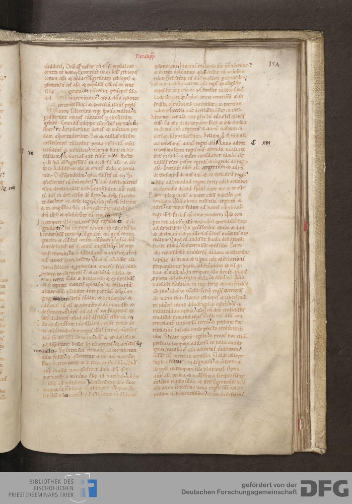 - TextGrid Repository (2017). Bibliothek des Bischöflichen Priesterseminars, Hs. 1. Inhalte. Bibliothek des Bischöflichen Priesterseminars Trier Hs. 1. Bibel aus St. Matthias/Altes Testament. Blatt 157r. Blatt 157r. Virtuelles Skriptorium St. Matthias. Bibliothek des Bischöflichen Priesterseminars Trier. https://hdl.handle.net/11378/0000-0006-0FC9-8