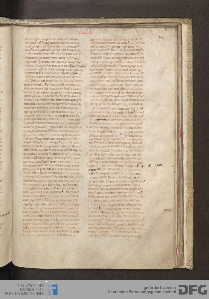 - TextGrid Repository (2017). Bibliothek des Bischöflichen Priesterseminars, Hs. 1. Inhalte. Bibliothek des Bischöflichen Priesterseminars Trier Hs. 1. Bibel aus St. Matthias/Altes Testament. Blatt 160r. Blatt 160r. Virtuelles Skriptorium St. Matthias. Bibliothek des Bischöflichen Priesterseminars Trier. https://hdl.handle.net/11378/0000-0006-0FD5-A