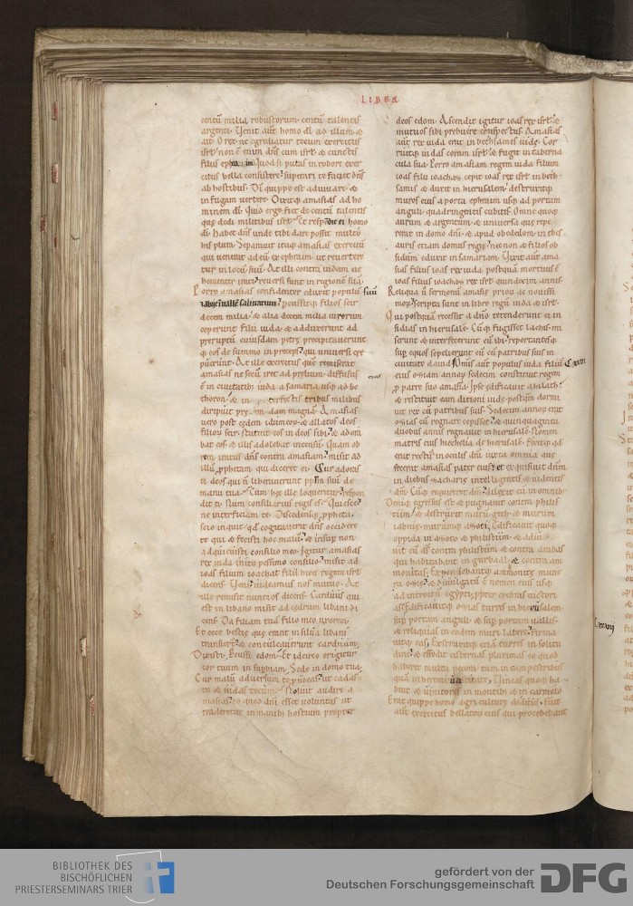 - TextGrid Repository (2017). Bibliothek des Bischöflichen Priesterseminars, Hs. 1. Inhalte. Bibliothek des Bischöflichen Priesterseminars Trier Hs. 1. Bibel aus St. Matthias/Altes Testament. Blatt 160v. Blatt 160v. Virtuelles Skriptorium St. Matthias. Bibliothek des Bischöflichen Priesterseminars Trier. https://hdl.handle.net/11378/0000-0006-0FD7-8