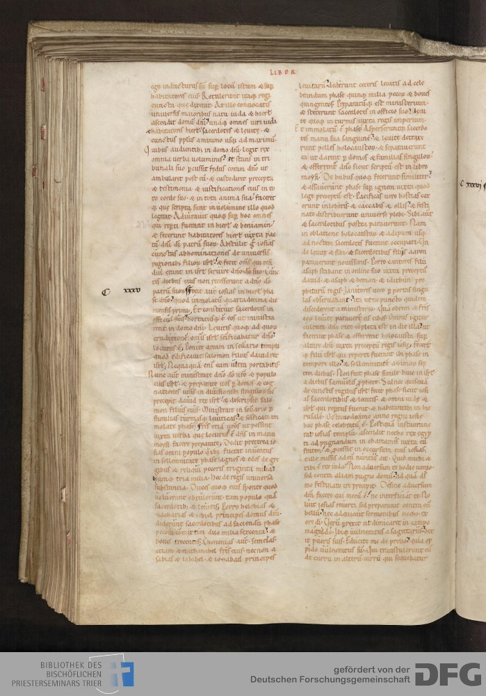 - TextGrid Repository (2017). Bibliothek des Bischöflichen Priesterseminars, Hs. 1. Inhalte. Bibliothek des Bischöflichen Priesterseminars Trier Hs. 1. Bibel aus St. Matthias/Altes Testament. Blatt 164v. Blatt 164v. Virtuelles Skriptorium St. Matthias. Bibliothek des Bischöflichen Priesterseminars Trier. https://hdl.handle.net/11378/0000-0006-0FE7-6