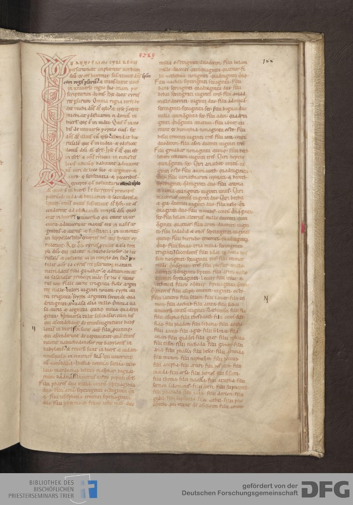 - TextGrid Repository (2017). Bibliothek des Bischöflichen Priesterseminars, Hs. 1. Inhalte. Bibliothek des Bischöflichen Priesterseminars Trier Hs. 1. Bibel aus St. Matthias/Altes Testament. Blatt 166r. Blatt 166r. Virtuelles Skriptorium St. Matthias. Bibliothek des Bischöflichen Priesterseminars Trier. https://hdl.handle.net/11378/0000-0006-0FED-0