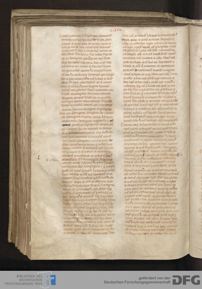 - TextGrid Repository (2017). Bibliothek des Bischöflichen Priesterseminars, Hs. 1. Inhalte. Bibliothek des Bischöflichen Priesterseminars Trier Hs. 1. Bibel aus St. Matthias/Altes Testament. Blatt 166v. Blatt 166v. Virtuelles Skriptorium St. Matthias. Bibliothek des Bischöflichen Priesterseminars Trier. https://hdl.handle.net/11378/0000-0006-0FEF-E