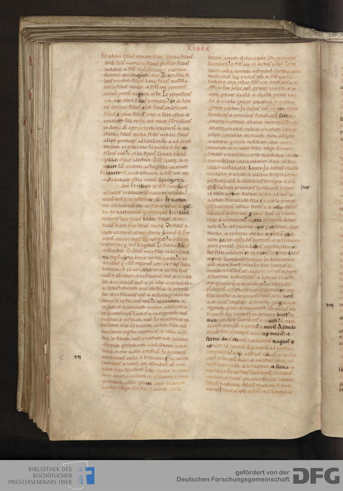 - TextGrid Repository (2017). Bibliothek des Bischöflichen Priesterseminars, Hs. 1. Inhalte. Bibliothek des Bischöflichen Priesterseminars Trier Hs. 1. Bibel aus St. Matthias/Altes Testament. Blatt 173v. Blatt 173v. Virtuelles Skriptorium St. Matthias. Bibliothek des Bischöflichen Priesterseminars Trier. https://hdl.handle.net/11378/0000-0006-100B-C