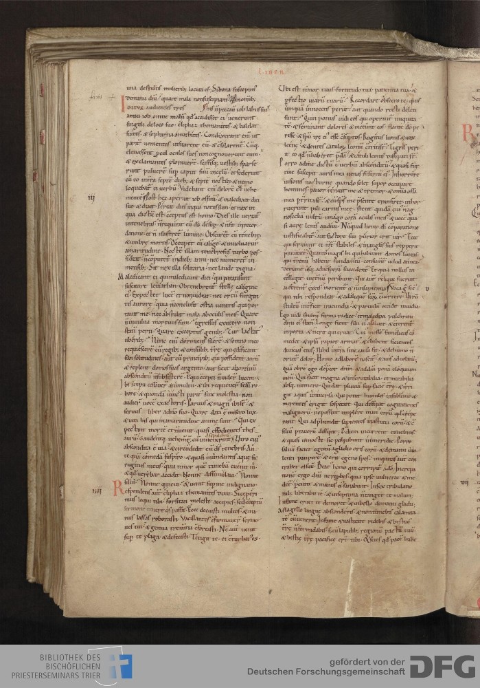 - TextGrid Repository (2017). Bibliothek des Bischöflichen Priesterseminars, Hs. 1. Inhalte. Bibliothek des Bischöflichen Priesterseminars Trier Hs. 1. Bibel aus St. Matthias/Altes Testament. Blatt 176v. Blatt 176v. Virtuelles Skriptorium St. Matthias. Bibliothek des Bischöflichen Priesterseminars Trier. https://hdl.handle.net/11378/0000-0006-1017-E