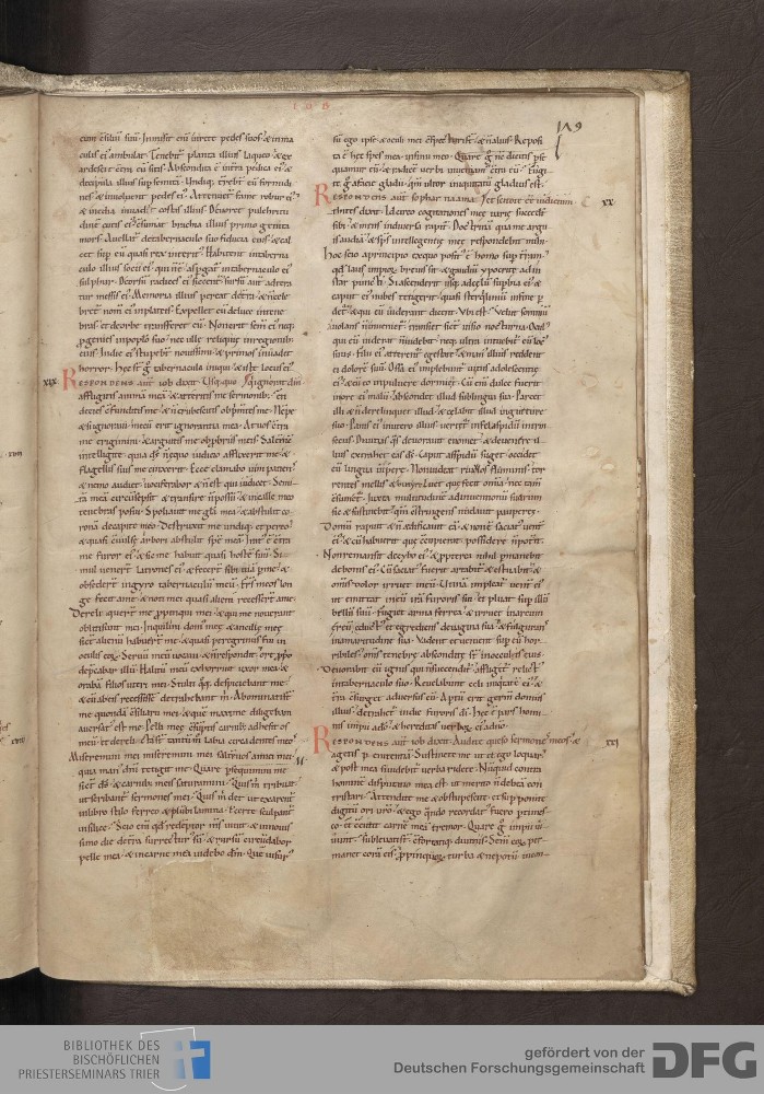 - TextGrid Repository (2017). Bibliothek des Bischöflichen Priesterseminars, Hs. 1. Inhalte. Bibliothek des Bischöflichen Priesterseminars Trier Hs. 1. Bibel aus St. Matthias/Altes Testament. Blatt 179r. Blatt 179r. Virtuelles Skriptorium St. Matthias. Bibliothek des Bischöflichen Priesterseminars Trier. https://hdl.handle.net/11378/0000-0006-1021-2