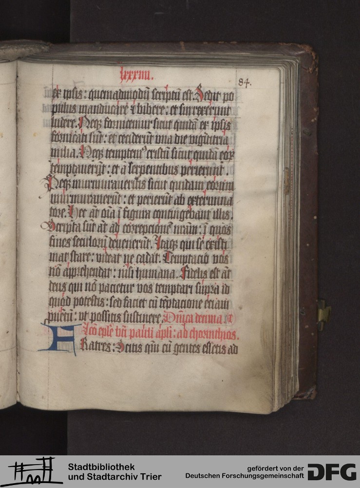 - TextGrid Repository (2017). Stadtbibliothek und Stadtarchiv Trier, Hs. 33/1838 8°: Sammelhandschrift. Inhalte. Stadtbibliothek und Stadtarchiv Trier Hs 33/1838 8°. Epistolar. Blatt 85r. Blatt 85r. Virtuelles Skriptorium St. Matthias. Stadtbibliothek und Stadtarchiv Trier. https://hdl.handle.net/11378/0000-0007-A2D8-E