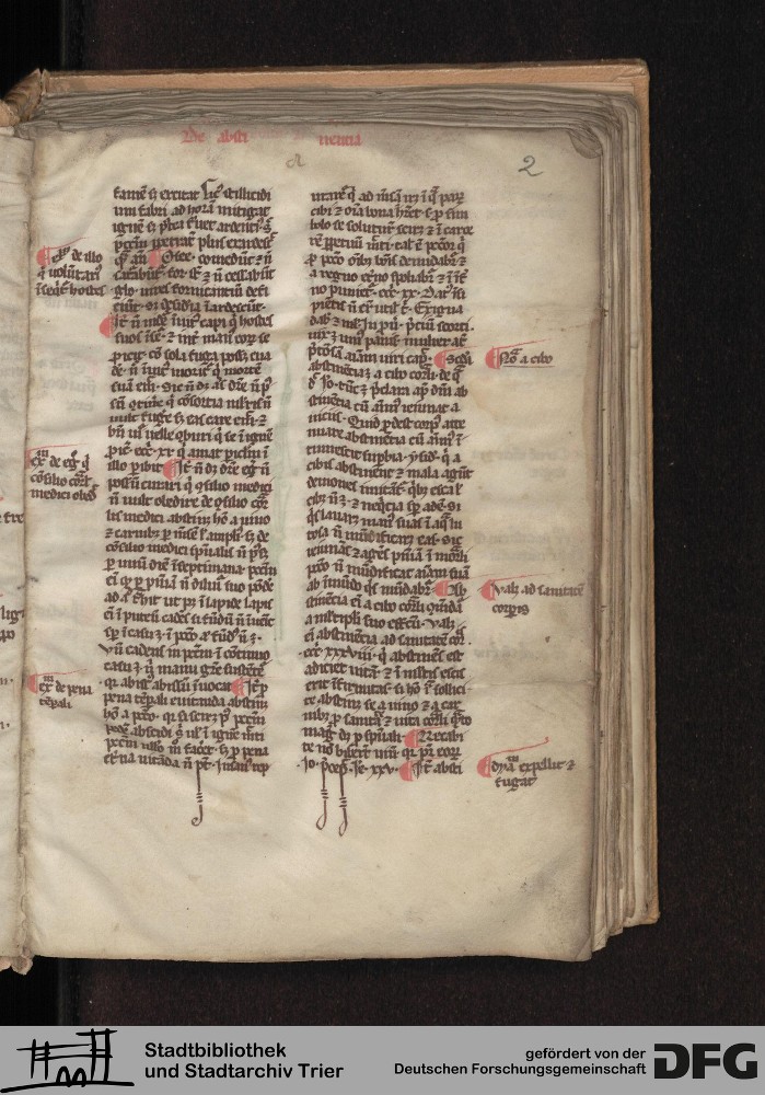 - TextGrid Repository (2017). Stadtbibliothek und Stadtarchiv Trier, Hs. 226/1386 8°: Sammelhandschrift. Inhalte. Stadtbibliothek und Stadtarchiv Trier Hs. 226/1386 8°. Summa abstinentiae, Predigthilfen nach Stichworten alphabetisch geordnet. Blatt 2r. Blatt 2r. Virtuelles Skriptorium St. Matthias. Stadtbibliothek und Stadtarchiv Trier. https://hdl.handle.net/11378/0000-0008-3300-E