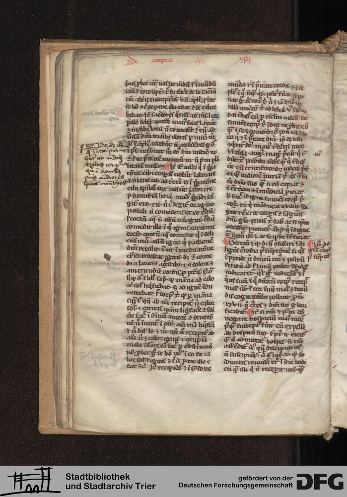 - TextGrid Repository (2017). Stadtbibliothek und Stadtarchiv Trier, Hs. 226/1386 8°: Sammelhandschrift. Inhalte. Stadtbibliothek und Stadtarchiv Trier Hs. 226/1386 8°. Summa abstinentiae, Predigthilfen nach Stichworten alphabetisch geordnet. Blatt 21v. Blatt 21v. Virtuelles Skriptorium St. Matthias. Stadtbibliothek und Stadtarchiv Trier. https://hdl.handle.net/11378/0000-0008-334E-8