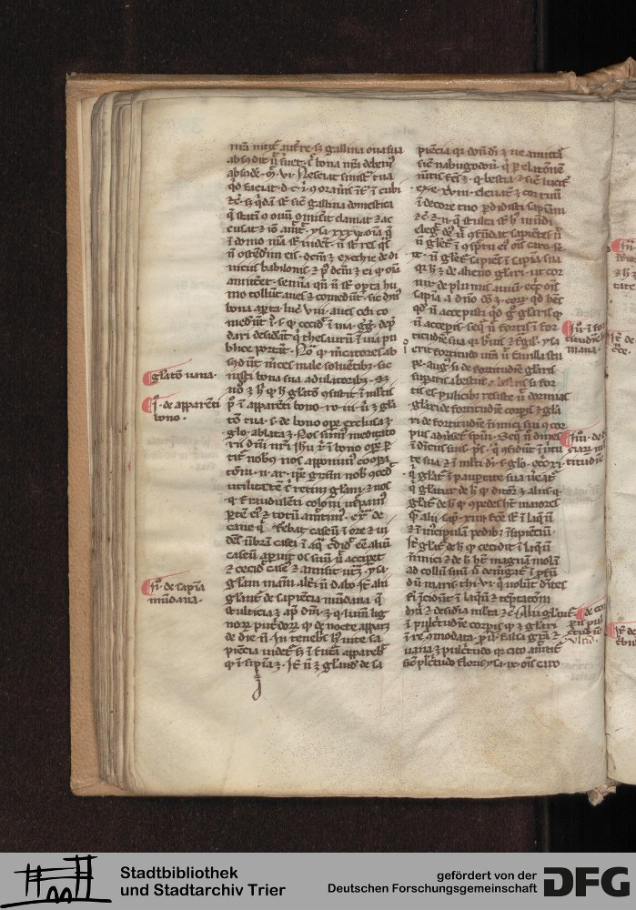 - TextGrid Repository (2017). Stadtbibliothek und Stadtarchiv Trier, Hs. 226/1386 8°: Sammelhandschrift. Inhalte. Stadtbibliothek und Stadtarchiv Trier Hs. 226/1386 8°. Summa abstinentiae, Predigthilfen nach Stichworten alphabetisch geordnet. Blatt 34v. Blatt 34v. Virtuelles Skriptorium St. Matthias. Stadtbibliothek und Stadtarchiv Trier. https://hdl.handle.net/11378/0000-0008-3382-B