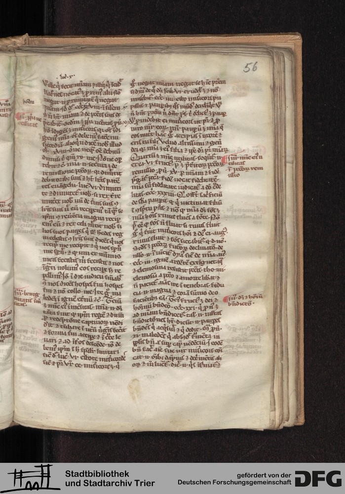 - TextGrid Repository (2017). Stadtbibliothek und Stadtarchiv Trier, Hs. 226/1386 8°: Sammelhandschrift. Inhalte. Stadtbibliothek und Stadtarchiv Trier Hs. 226/1386 8°. Summa abstinentiae, Predigthilfen nach Stichworten alphabetisch geordnet. Blatt 56r. Blatt 56r. Virtuelles Skriptorium St. Matthias. Stadtbibliothek und Stadtarchiv Trier. https://hdl.handle.net/11378/0000-0008-33D8-B