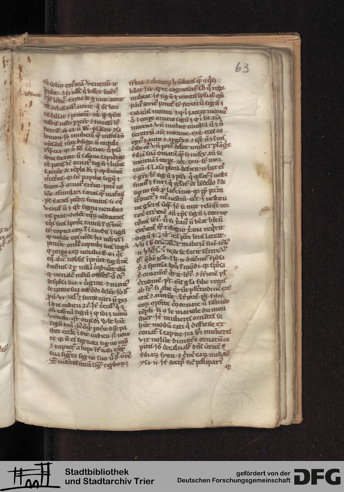 - TextGrid Repository (2017). Stadtbibliothek und Stadtarchiv Trier, Hs. 226/1386 8°: Sammelhandschrift. Inhalte. Stadtbibliothek und Stadtarchiv Trier Hs. 226/1386 8°. Summa abstinentiae, Predigthilfen nach Stichworten alphabetisch geordnet. Blatt 63r. Blatt 63r. Virtuelles Skriptorium St. Matthias. Stadtbibliothek und Stadtarchiv Trier. https://hdl.handle.net/11378/0000-0008-33F4-B