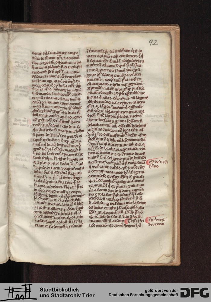 - TextGrid Repository (2017). Stadtbibliothek und Stadtarchiv Trier, Hs. 226/1386 8°: Sammelhandschrift. Inhalte. Stadtbibliothek und Stadtarchiv Trier Hs. 226/1386 8°. Summa abstinentiae, Predigthilfen nach Stichworten alphabetisch geordnet. Blatt 92r. Blatt 92r. Virtuelles Skriptorium St. Matthias. Stadtbibliothek und Stadtarchiv Trier. https://hdl.handle.net/11378/0000-0008-3468-9