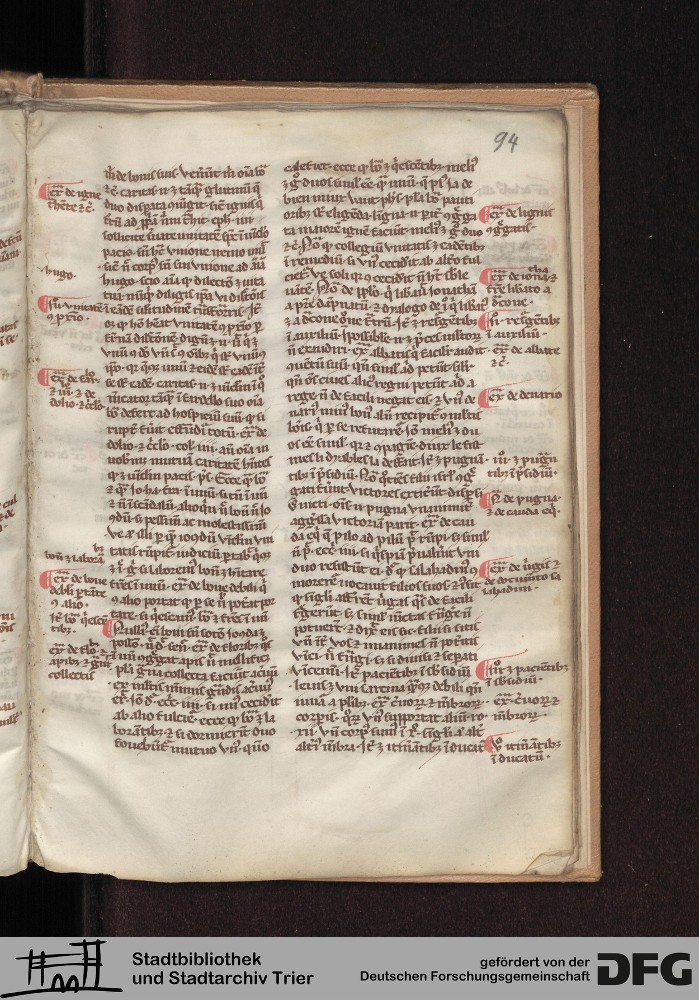 - TextGrid Repository (2017). Stadtbibliothek und Stadtarchiv Trier, Hs. 226/1386 8°: Sammelhandschrift. Inhalte. Stadtbibliothek und Stadtarchiv Trier Hs. 226/1386 8°. Summa abstinentiae, Predigthilfen nach Stichworten alphabetisch geordnet. Blatt 94r. Blatt 94r. Virtuelles Skriptorium St. Matthias. Stadtbibliothek und Stadtarchiv Trier. https://hdl.handle.net/11378/0000-0008-3470-F