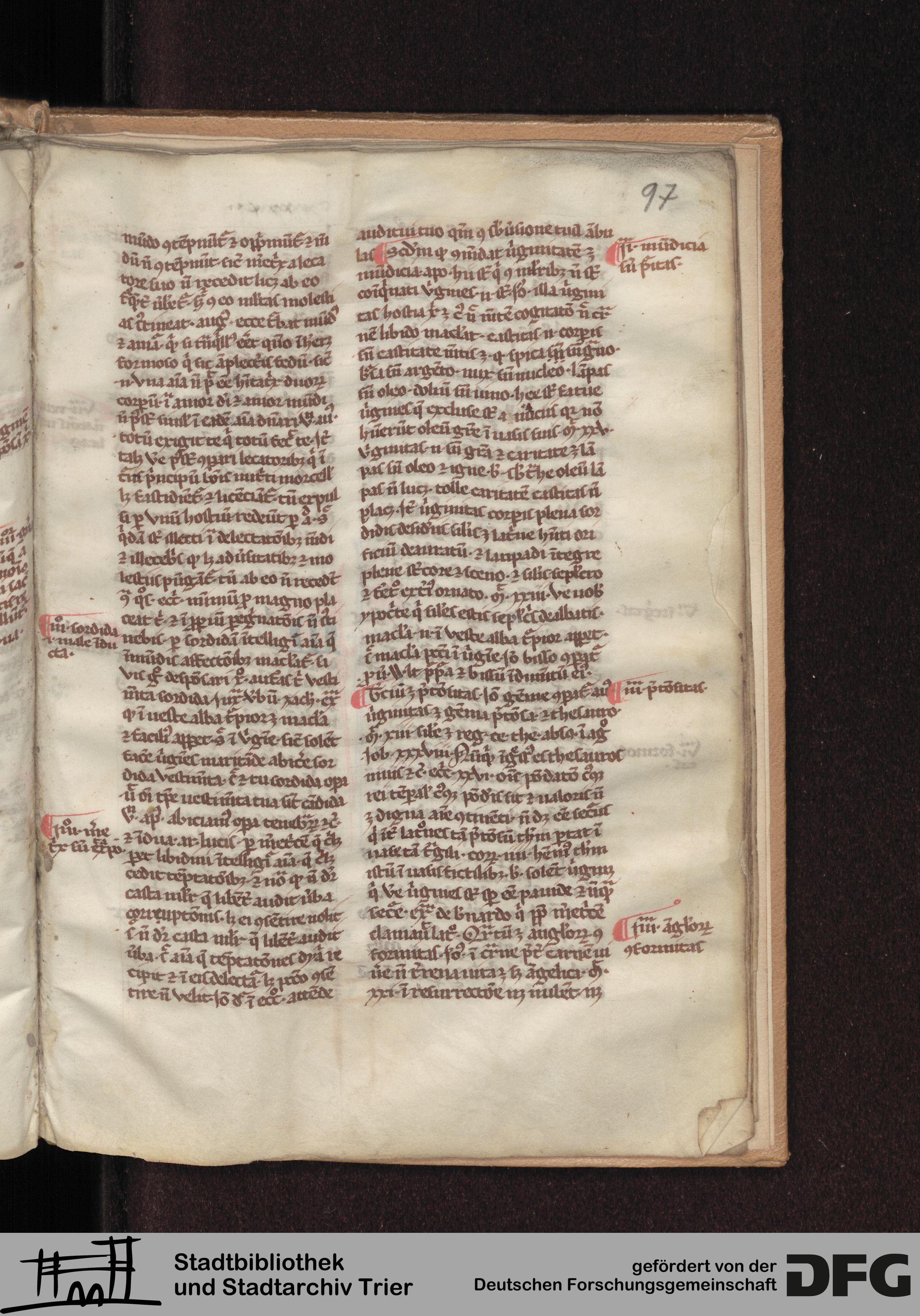 - TextGrid Repository (2017). Stadtbibliothek und Stadtarchiv Trier, Hs. 226/1386 8°: Sammelhandschrift. Inhalte. Stadtbibliothek und Stadtarchiv Trier Hs. 226/1386 8°. Summa abstinentiae, Predigthilfen nach Stichworten alphabetisch geordnet. Blatt 97r. Blatt 97r. Virtuelles Skriptorium St. Matthias. Stadtbibliothek und Stadtarchiv Trier. https://hdl.handle.net/11378/0000-0008-347C-3