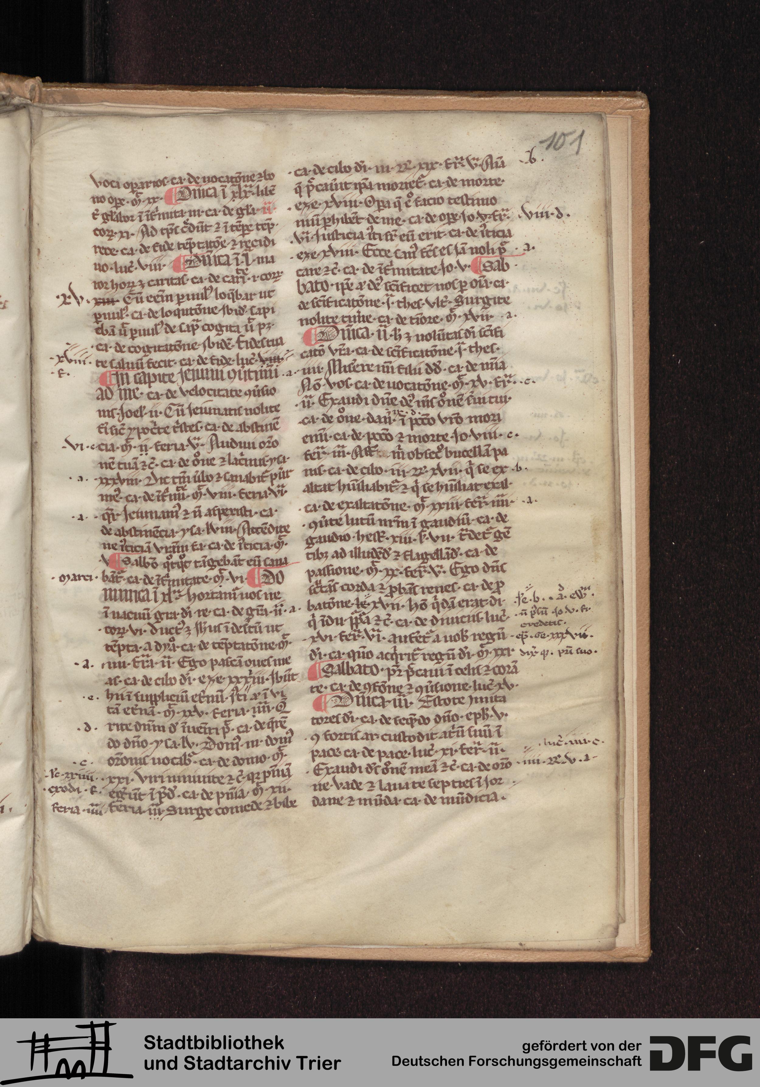 - TextGrid Repository (2017). Stadtbibliothek und Stadtarchiv Trier, Hs. 226/1386 8°: Sammelhandschrift. Inhalte. Stadtbibliothek und Stadtarchiv Trier Hs. 226/1386 8°. Zuordnung dieser Predigten zu den Festen und Tagen des Temporale. Blatt 101r. Blatt 101r. Virtuelles Skriptorium St. Matthias. Stadtbibliothek und Stadtarchiv Trier. https://hdl.handle.net/11378/0000-0008-348C-0